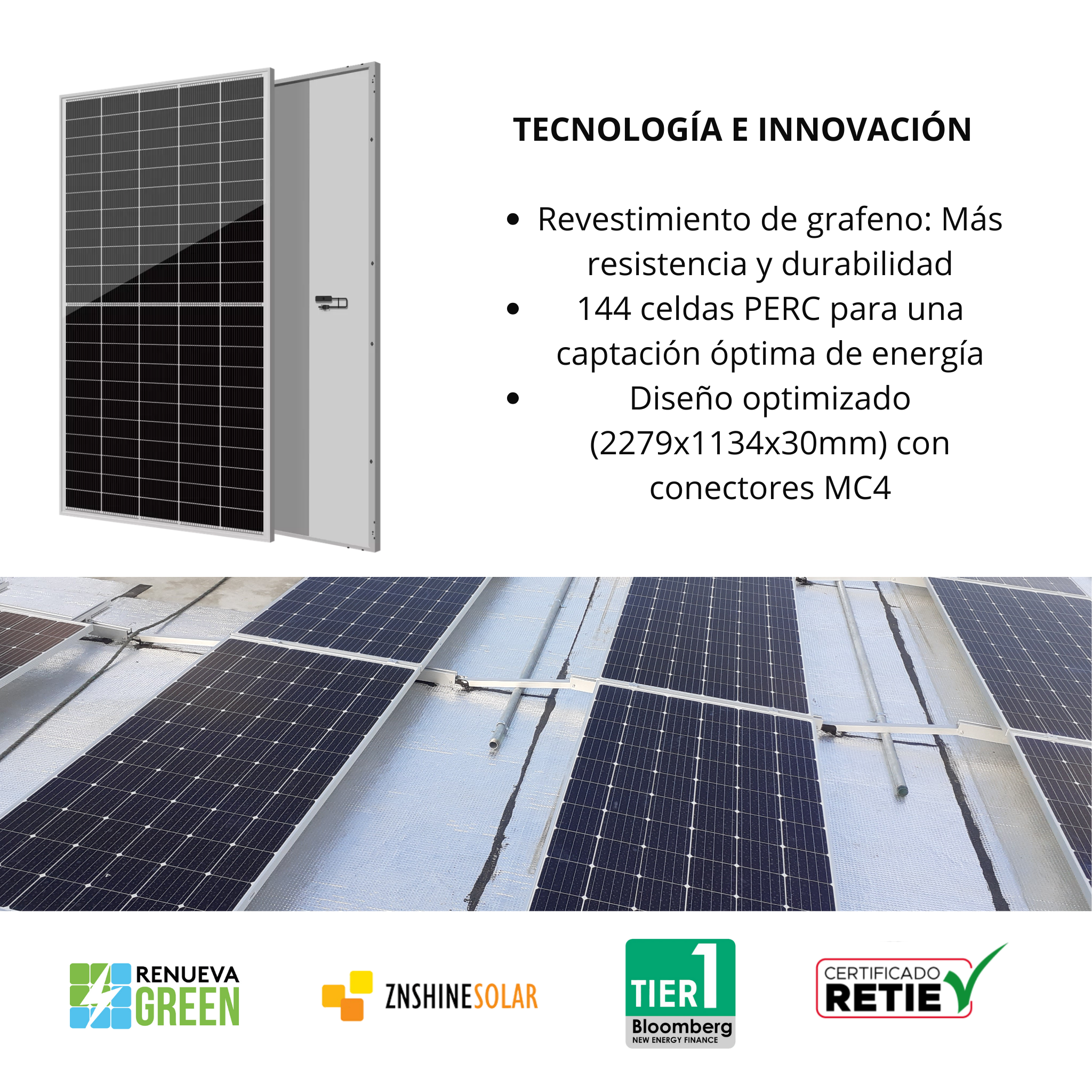 ¡Optimiza tu sistema solar con lo último en tecnología! Este panel monocristalino de 580W con celdas tipo N TOPCon y 16BB ofrece mayor eficiencia y rendimiento. Su revestimiento de grafeno incrementa la resistencia, y sus 144 celdas PERC garantizan una captación óptima de energía. Con conectores MC4 y dimensiones de 2279x1134x30mm, es ideal para proyectos solares de alto nivel. ¡Mayor potencia, mayor eficiencia y máxima durabilidad con certificación RETIE!