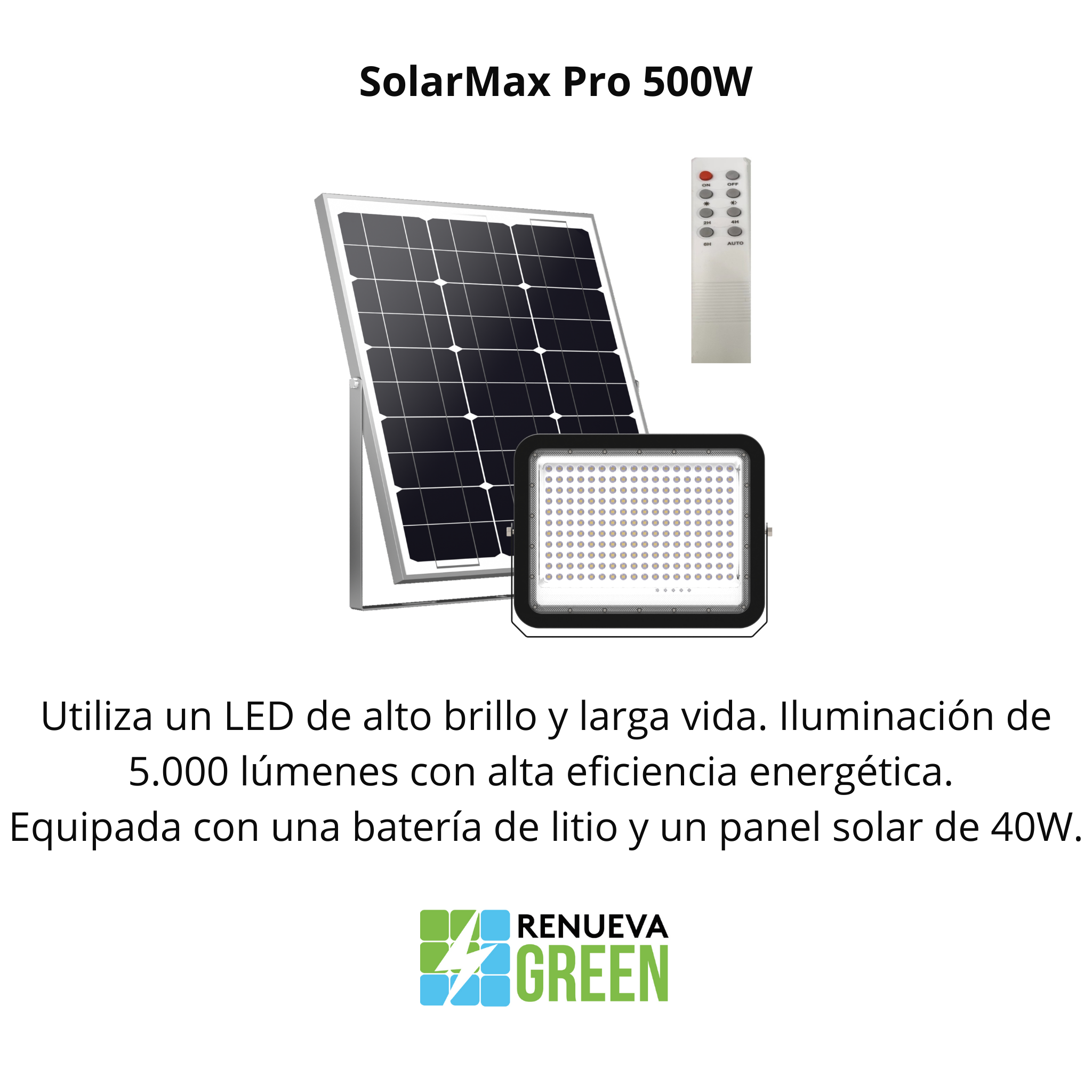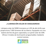 Lámpara solar exterior reflector de 7.000 lúmenes 500W,Luz Blanca, 3 niveles de iluminación, Metálico, altura de instalación 7 metros, ilumina 20 metros de ancho y 20 de frente