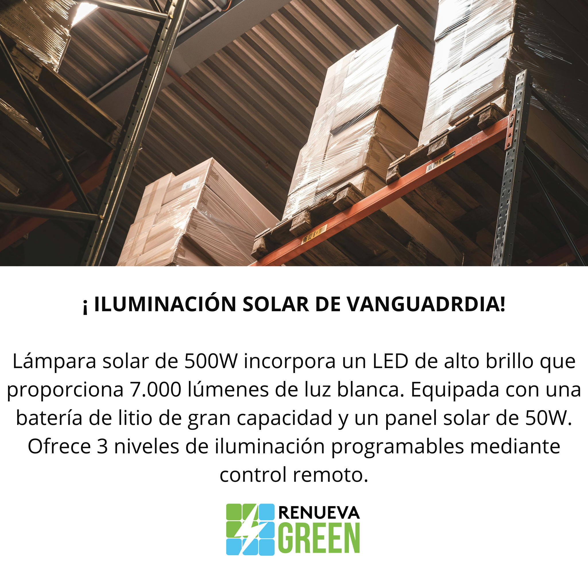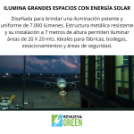 ¡Ilumina grandes espacios sin gastar en electricidad! Con 7.000 lúmenes de luz blanca y tres niveles de iluminación, este reflector solar de 500W brinda máxima eficiencia y rendimiento. Su estructura metálica resistente y su instalación a 7 metros de altura permiten iluminar 20 metros de ancho y 20 metros de frente. Perfecto para fábricas, bodegas, estacionamientos y áreas de seguridad. ¡Gran cobertura, resistencia y energía 100% solar!