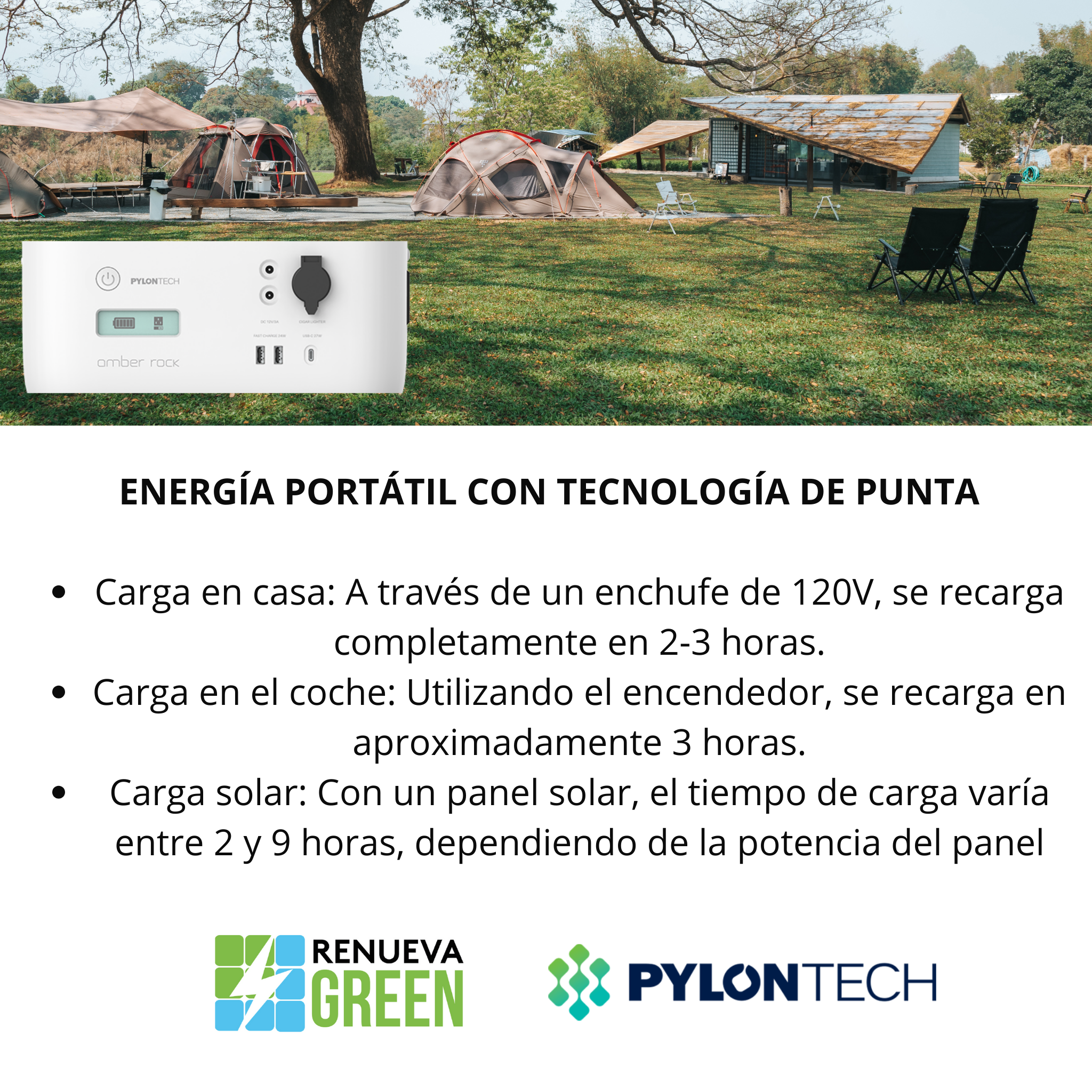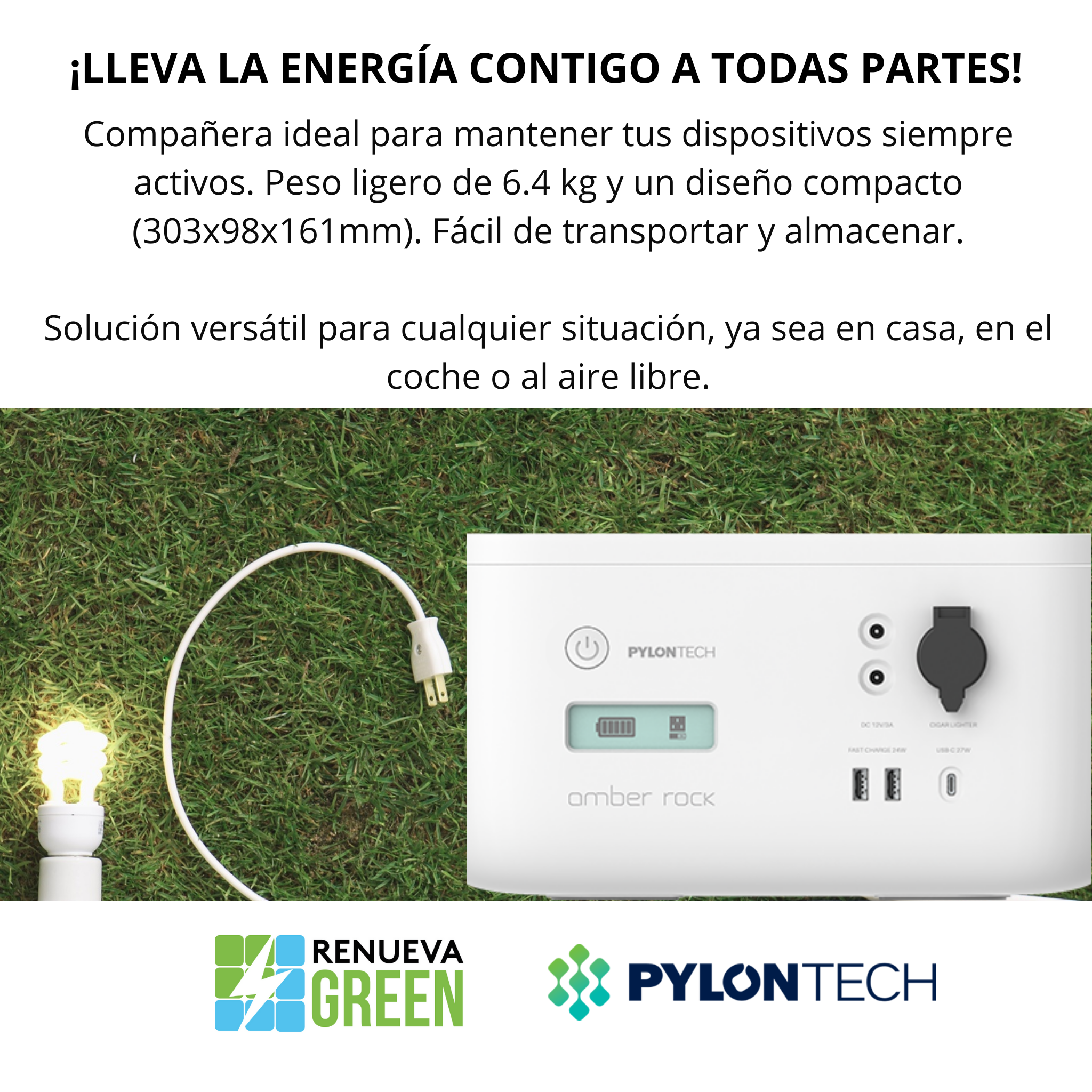 ¡Lleva la energía contigo! La estación Amber Rock de Pylontech, con 473Wh y 6.4 kg, te ofrece 300W de potencia para mantener tus dispositivos cargados en cualquier lugar. Carga rápida con 120V en 2-3 horas, Auto en 3 horas y FV entre 2-9 horas. Con salidas AC, USB, PD 2.0 y DC Jack, es versátil y perfecta para tus necesidades. Además, su señal SOS agrega una capa extra de seguridad. ¡La energía portátil y confiable que necesitas!
